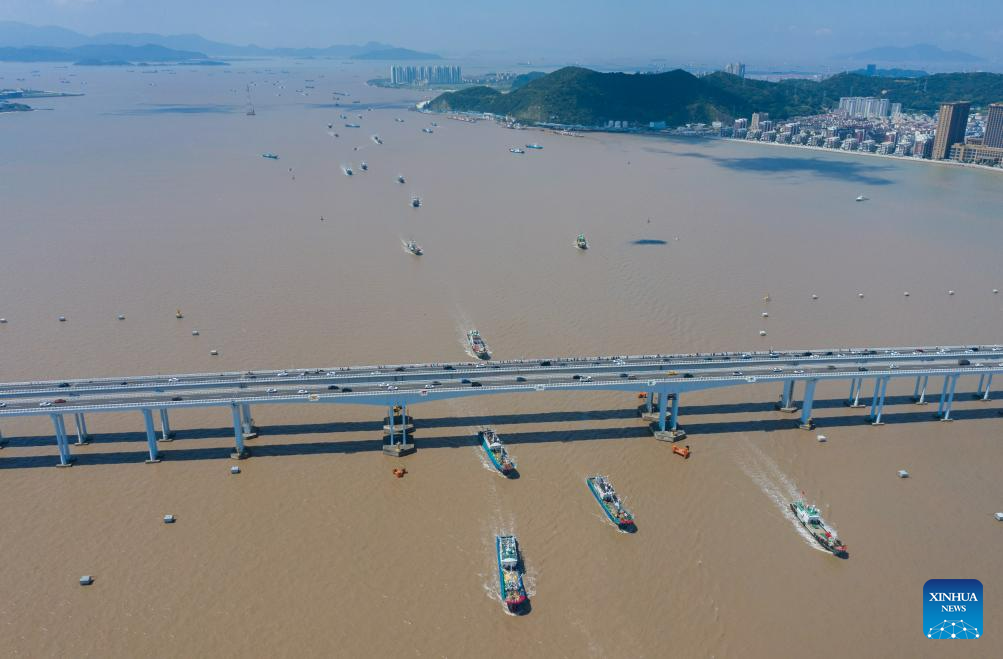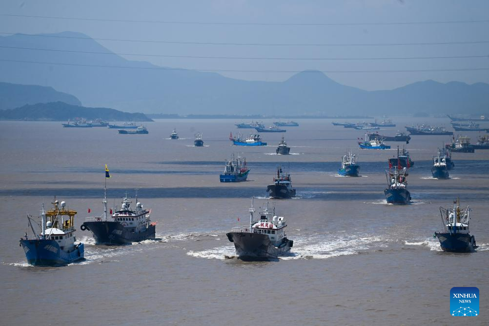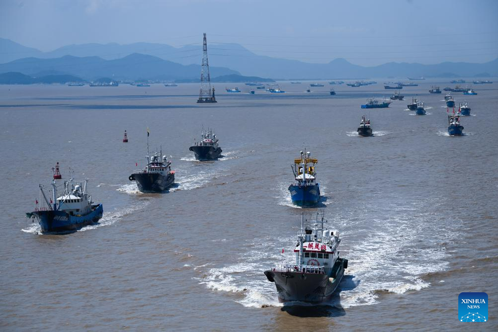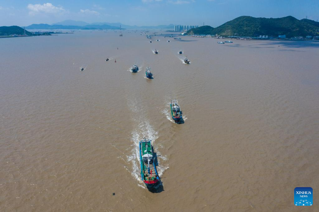 This aerial photo shows fishing boats setting sail for fishing from Shenjiamen port in Zhoushan City, east China's Zhejiang Province, Aug. 6, 2023. Four types of fishing boats with special permission set sail on Sunday after a summer fishing ban, which was originally scheduled to end on Aug. 1 but has been postponed for a few days due to typhoon concerns. (Xinhua/Xu Yu)