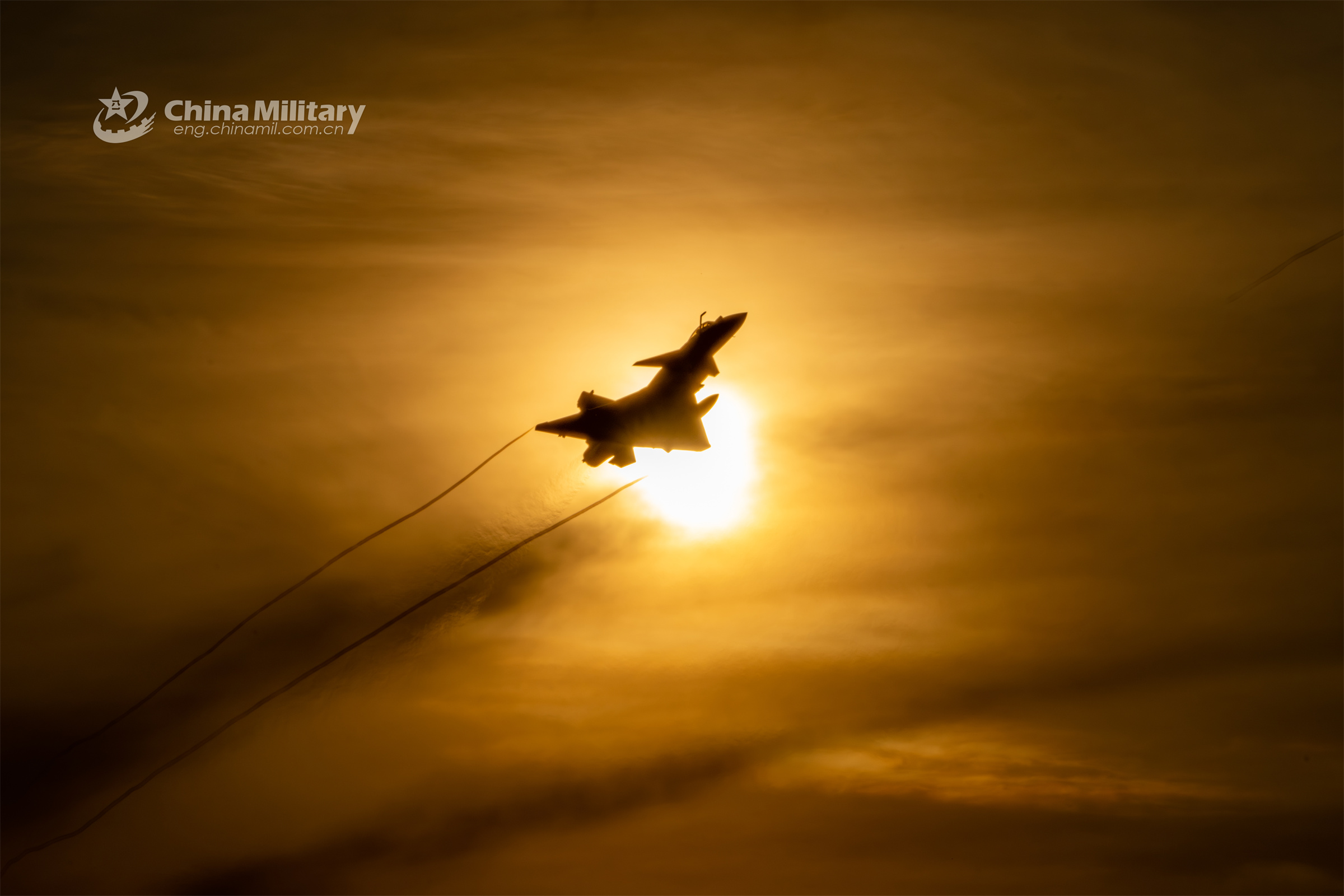A J-10 fighter jet attached to an aviation brigade of the air force under the PLA Southern Theater Command takes off towards a training airspace at sunrise during a recent flight training exercise. (eng.chinamil.com.cn/Photo by Hou Kaiwen)