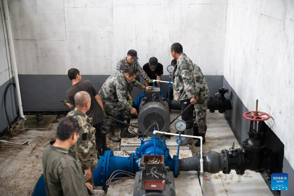 Staff members repair pumps at a tap water station in Changting Township, Hailin City in northeast China's Heilongjiang Province, Aug. 6, 2023. Tap water and power supply has been interrupted in parts of Changting Township due to recent flooding, which also damaged some of the residences there. Residents and rescuers are working all out to put life back to normal. (Xinhua/Zhang Tao)