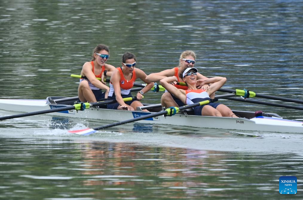 Team of the Netherlands react after the rowing women's four final A at the 31st FISU Summer World University Games in Chengdu, southwest China's Sichuan Province, Aug. 6, 2023. (Xinhua/Zhang Bowen)