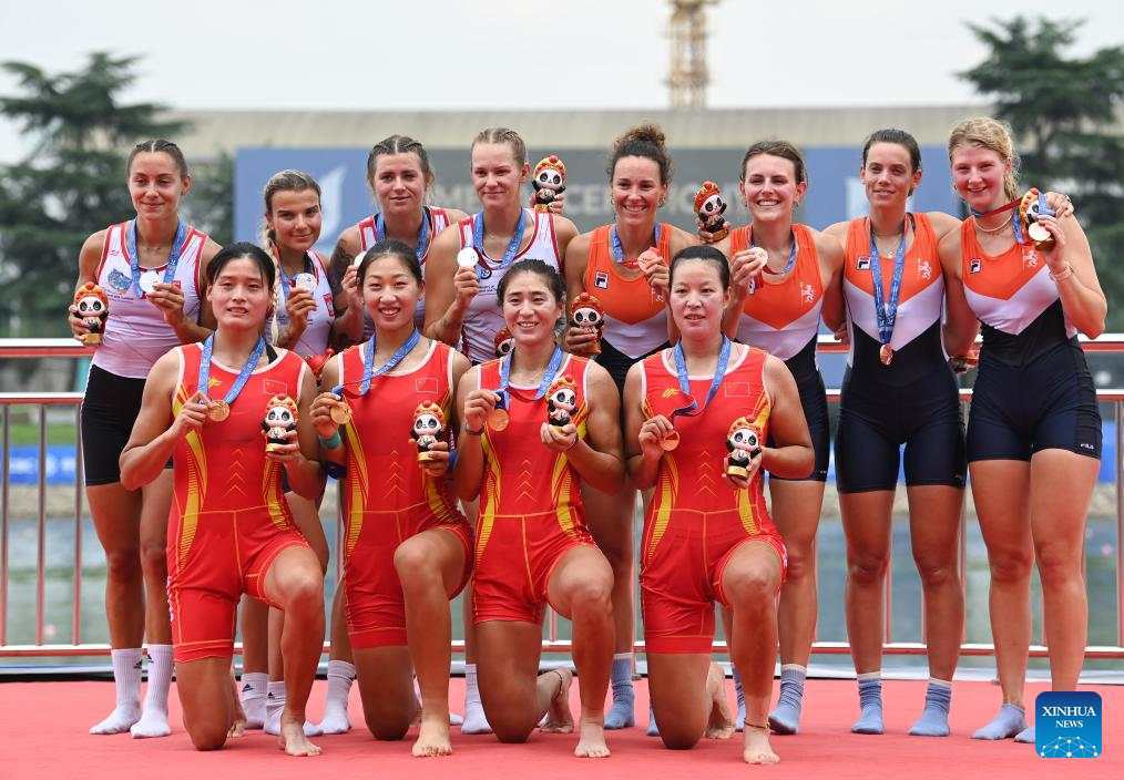Gold medalists Team China (C), silver medalists Team Poland and bronze medalists Team of the Netherlands pose during the awarding ceremony for rowing women's four at the 31st FISU Summer World University Games in Chengdu, southwest China's Sichuan Province, Aug. 6, 2023. (Xinhua/Zhang Bowen)