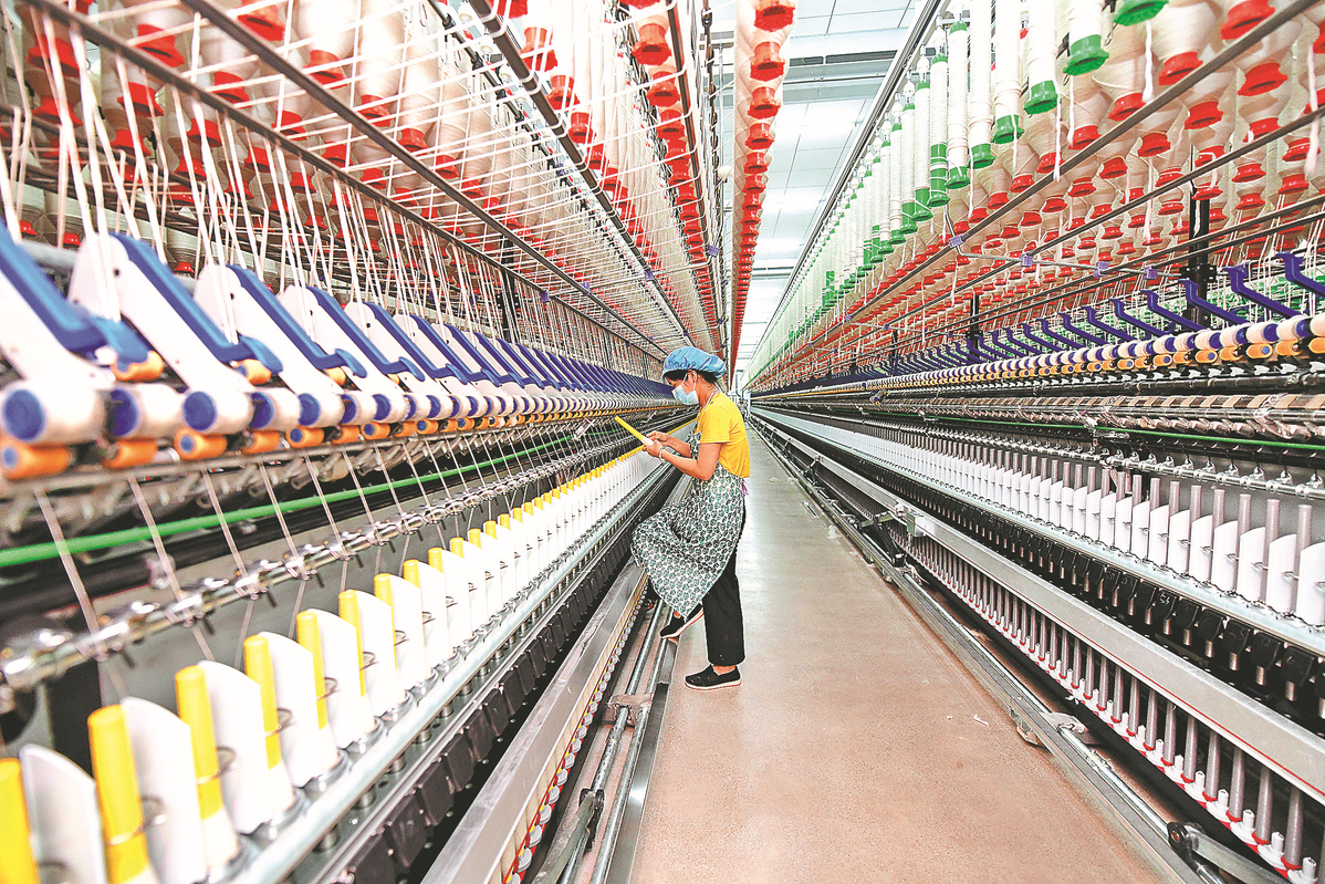 An employee works on a cotton yarn production line at an intelligent mechanized workshop of a textile company in Ganzhou, Jiangxi province, in May 2022. [ZHU HAIPENG/FOR CHINA DAILY]