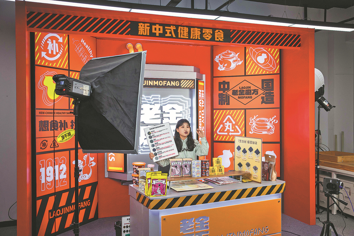 An anchor promotes snacks from a livestreaming studio of a healthcare company in Hangzhou, Zhejiang province, on March 23. [JIANG HAN/XINHUA]