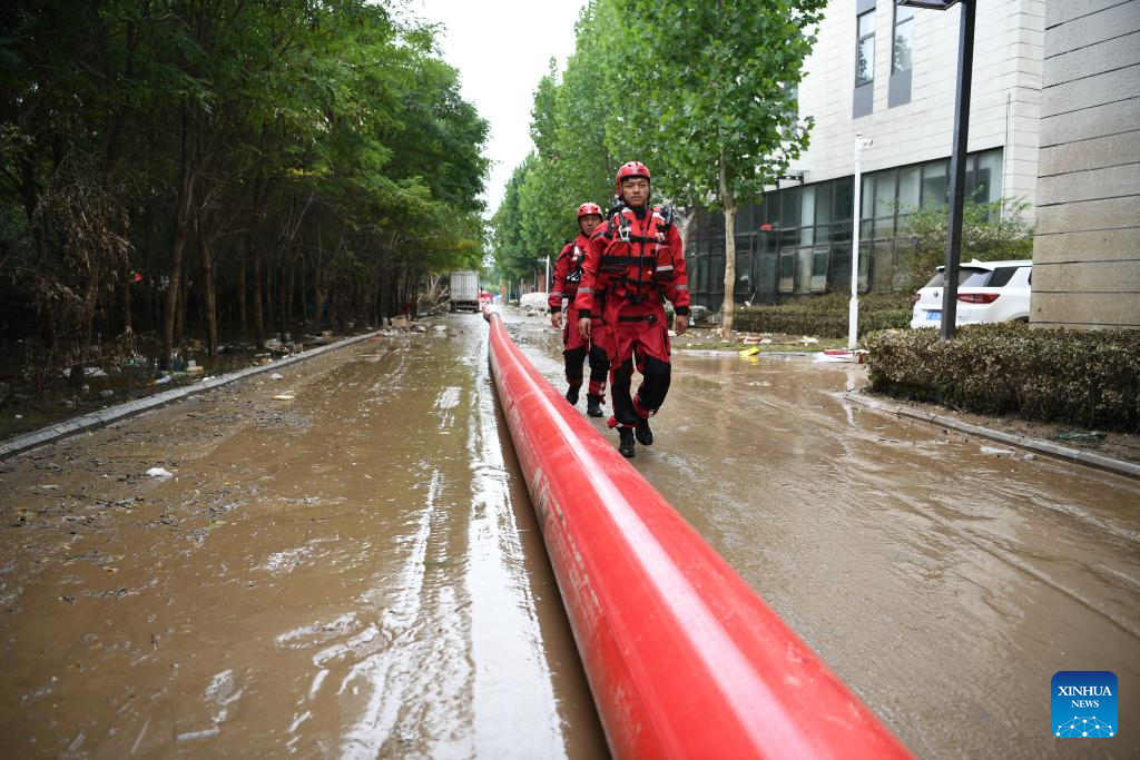 Rescuers perform drainage operation in downtown Zhuozhou, north China's Hebei Province, on Aug. 7, 2023. More than 800 rescuers redeployed from Tangshan, Handan, Hengshui and other cities of the province have been working around the clock in the most seriously flooded areas of Zhuozhou, trying to put life back to normal as soon as possible. (Xinhua/Mu Yu)