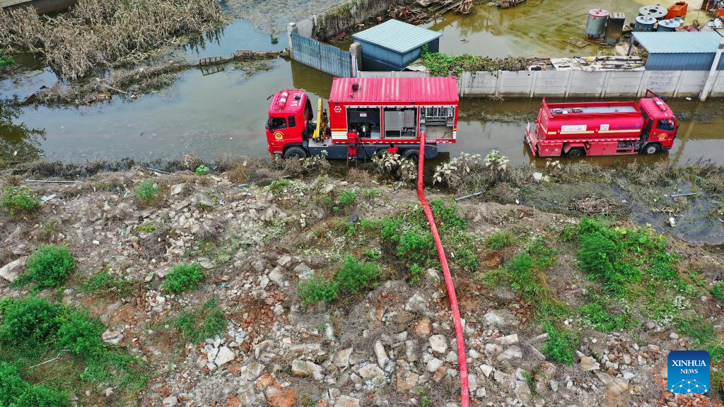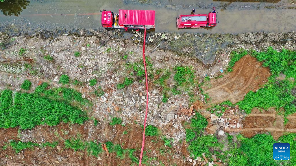 Rescuers perform drainage operation in Linjiatun Township of Zhuozhou, north China's Hebei Province, on Aug. 7, 2023. More than 800 rescuers redeployed from Tangshan, Handan, Hengshui and other cities of the province have been working around the clock in the most seriously flooded areas of Zhuozhou, trying to put life back to normal as soon as possible. (Xinhua/Mu Yu)