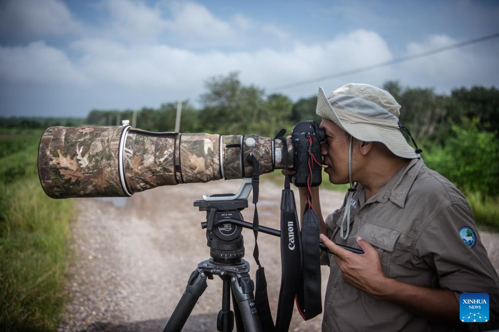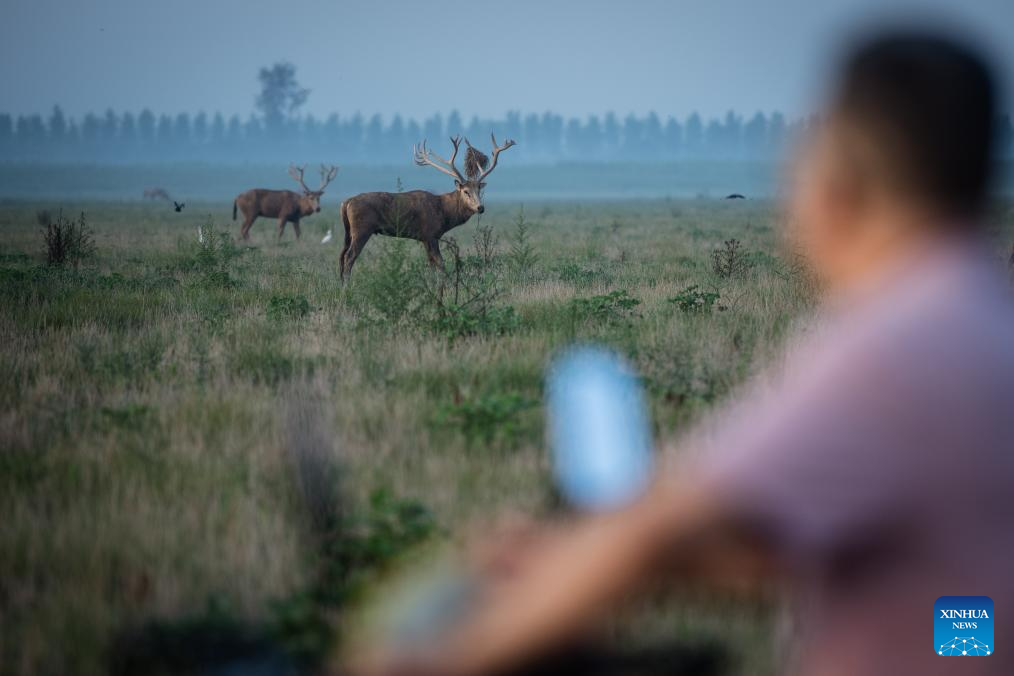 Engineer Zhang Yuming takes photos of milu deer at Shishou Milu Deer National Nature Reserve in central China's Hubei Province, Aug. 2, 2023. (Xinhua/Wu Zhizun)