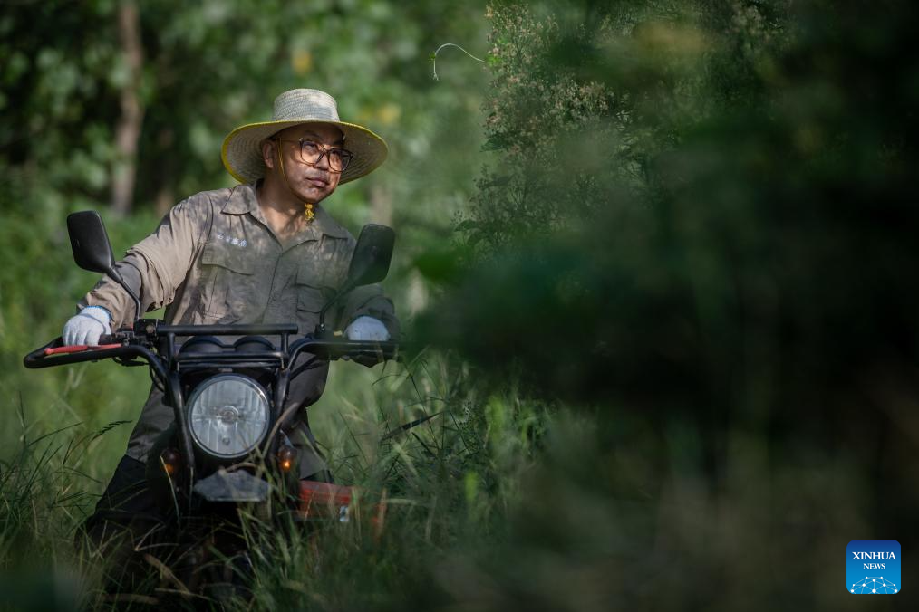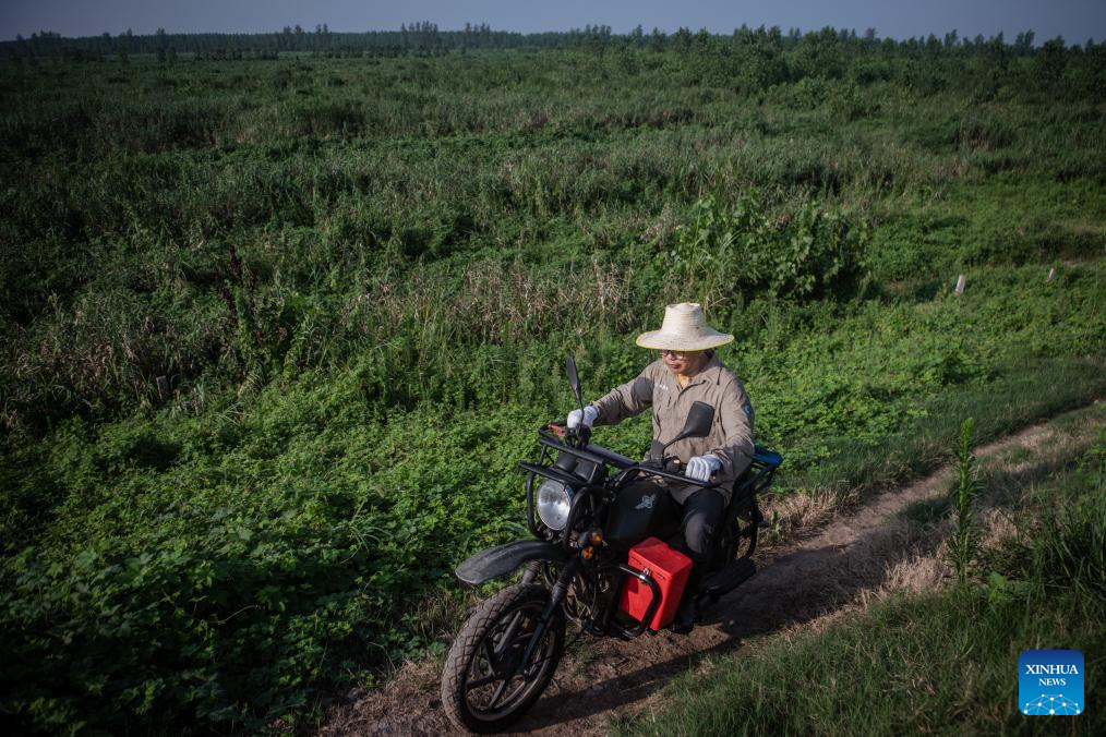 Ranger Wang Chuanjun patrols Shishou Milu Deer National Nature Reserve in central China's Hubei Province, Aug. 1, 2023. (Xinhua/Wu Zhizun)
