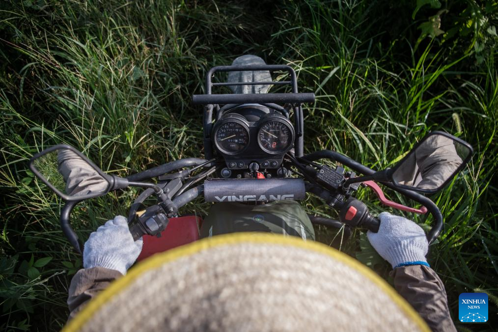 Ranger Wang Chuanjun patrols in Shishou Milu Deer National Nature Reserve in central China's Hubei Province, Aug. 1, 2023. (Xinhua/Wu Zhizun)