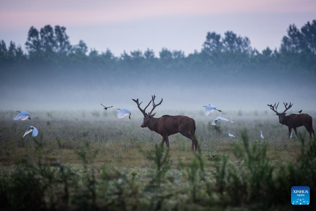 After years of efforts by protectors and continuous improvement of the local ecological environment, the population of milu deer at the nature reserve has increased rapidly, nearing 2,000 to date. There are more than 10 naturally formed breeding groups in varying sizes among these milu deer, and more baby milu deer are expected to come to the world after mating season this year.