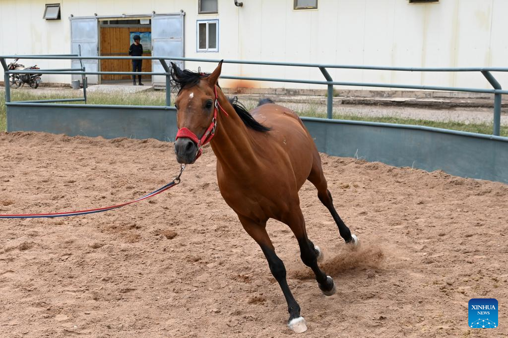 This photo taken on Aug. 6, 2023 shows Shandan horses at the Shandan Horse Breeding Farm in Shandan County, Zhangye City, northwest China's Gansu Province. Lying at the foothill of the Qilian Mountains, the Shandan Horse Breeding Farm has a history of over 2,000 years and now serves as a major horse breeding facility in China. Shandan horse, a species exclusively bred by the farm, boasts physical fitness and good endurance. (Xinhua/Ma Ning)