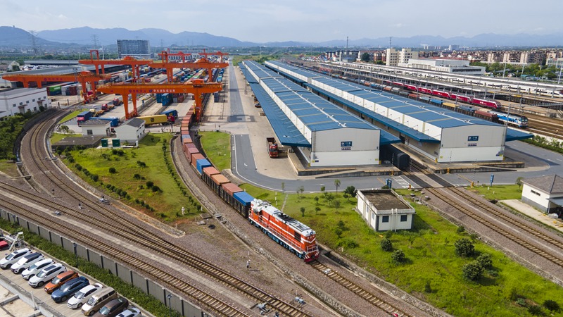 A freight train loaded with 110 twenty-foot equivalent unit containers of goods departs from Yiwu West Railway Station in Yiwu, east China’s Zhejiang Province, July 29, 2023. (Photo/Qian Xusheng)