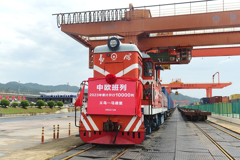On July 29, a China-Europe freight train loaded with 110 twenty-foot equivalent unit (TEU) containers of various goods, such as automotive parts, electric bicycles, and photovoltaic modules, departed from Yiwu West Railway Station in Yiwu for Madrid. This marked the 10,000th trip by China-Europe freight trains this year. The train will pass through the Alataw Pass in northwest China's Xinjiang Uygur Autonomous Region and arrive in Madrid around Aug. 19.