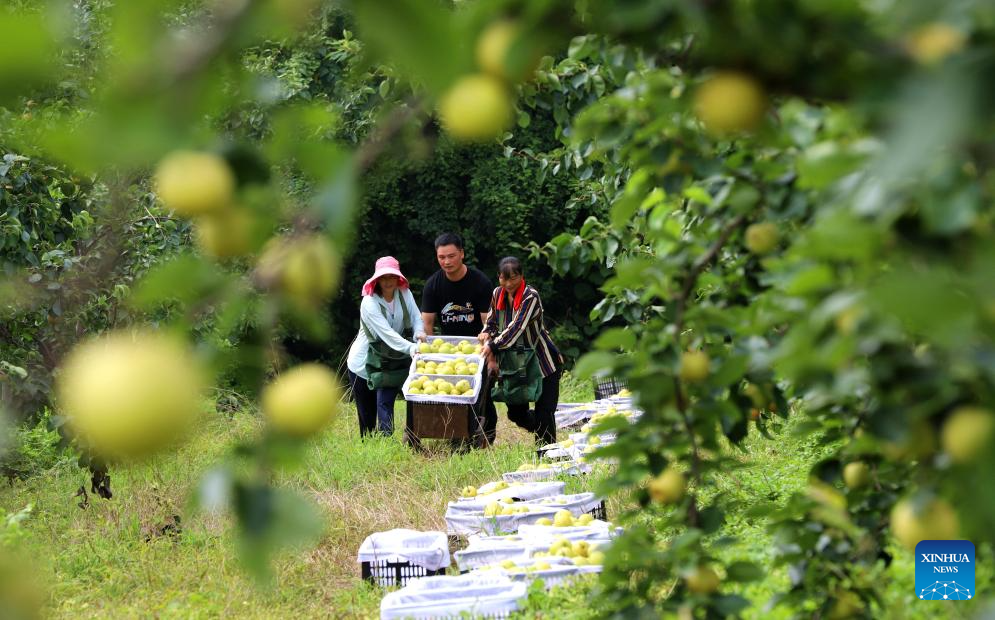 Farmers transport newly-picked pears in Yicheng District of Zhumadian City, central China's Henan Province, Aug. 7, 2023. Tuesday marks "Liqiu", or the beginning of autumn, the first day of autumn on the Chinese lunar calendar. Farmers in different areas of the country are busy with harvesting. (Photo by Mi Shan/Xinhua)