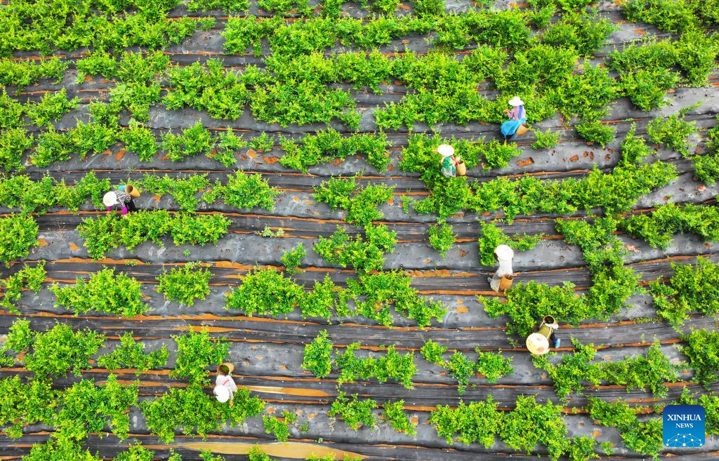 Farmers harvest chili peppers at a chili planting base in Nanshao Township of Jianhe County, southwest China's Guizhou Province, Aug. 7, 2023. Tuesday marks "Liqiu", or the beginning of autumn, the first day of autumn on the Chinese lunar calendar. Farmers in different areas of the country are busy with harvesting. (Photo by Wan Wenjie/Xinhua)