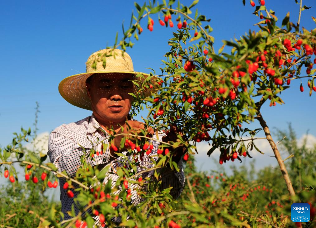 A farmer collects Chinese wolfberries at a wolfberry base in Ganzhou District of Zhangye City, northwest China's Gansu Province, Aug. 6, 2023. Tuesday marks "Liqiu", or the beginning of autumn, the first day of autumn on the Chinese lunar calendar. Farmers in different areas of the country are busy with harvesting. (Photo by Chen Li/Xinhua)