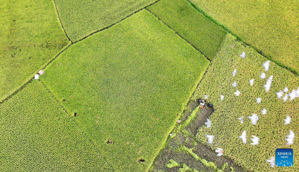 This aerial photo taken on Aug. 7, 2023 shows farmers weeding a paddy field in Nanjing, capital of east China's Jiangsu Province. Tuesday marks "Liqiu", or the beginning of autumn, the first day of autumn on the Chinese lunar calendar. Farmers in different areas of the country are busy with harvesting. (Photo by Du Yi/Xinhua)