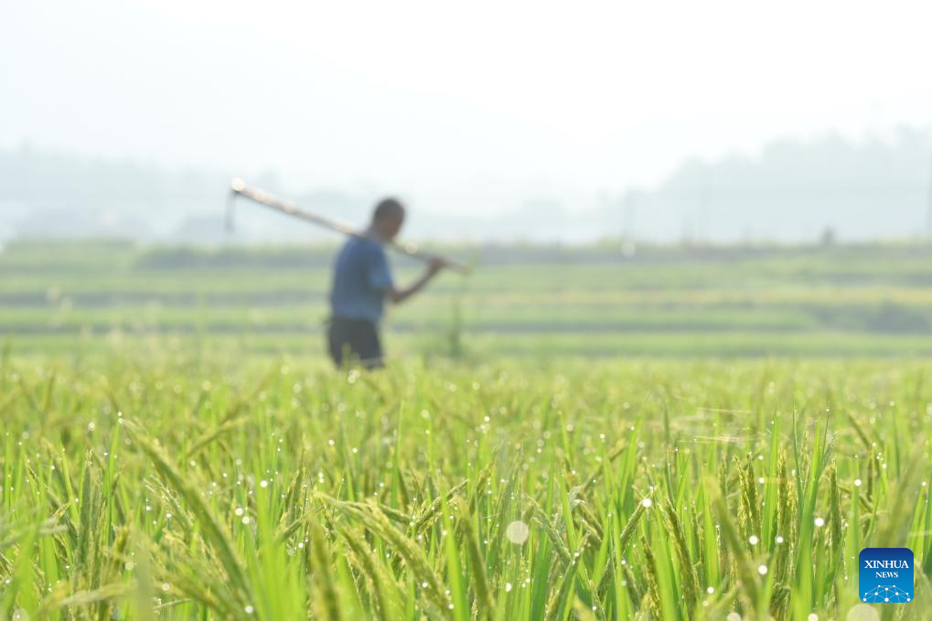 A farmer works in a field in Shuangfeng County, Loudi City, central China's Hunan Province, Aug. 7, 2023. Tuesday marks "Liqiu", or the beginning of autumn, the first day of autumn on the Chinese lunar calendar. Farmers in different areas of the country are busy with harvesting. (Photo by Li Jianxin/Xinhua)
