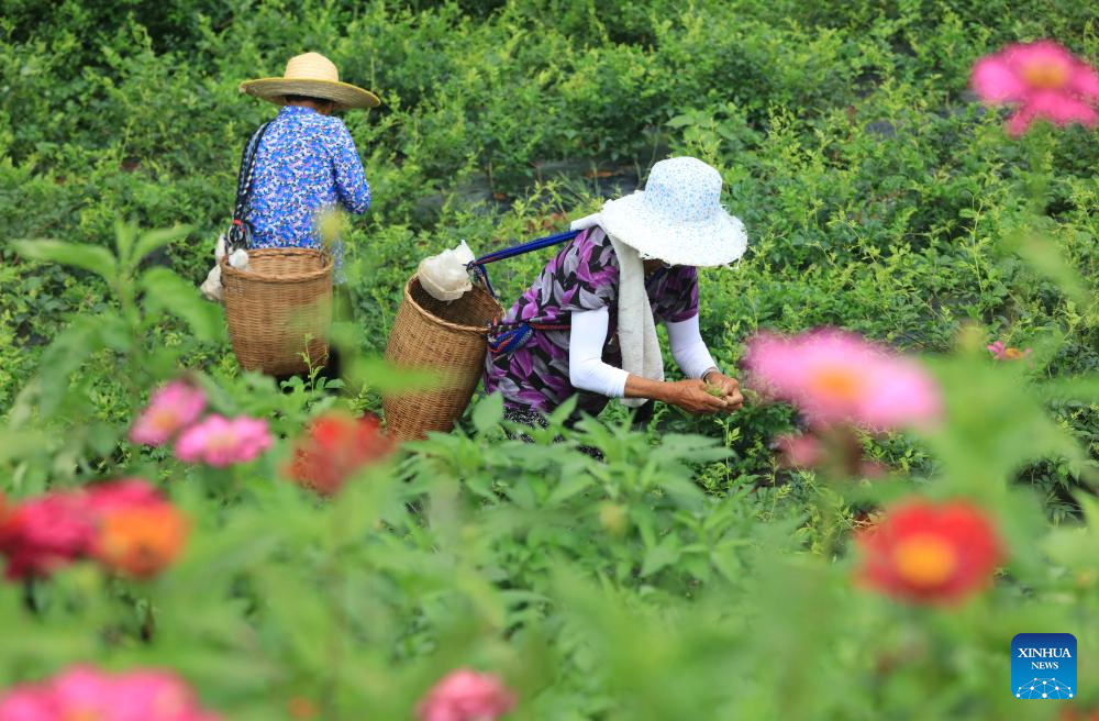 Farmers pick fresh tea leaves at a tea garden in Wulingyuan District of Zhangjiajie City, central China's Hunan Province, on Aug. 7, 2023. Tuesday marks "Liqiu", or the beginning of autumn, the first day of autumn on the Chinese lunar calendar. Farmers in different areas of the country are busy with harvesting. (Photo by Wu Yongbing/Xinhua)