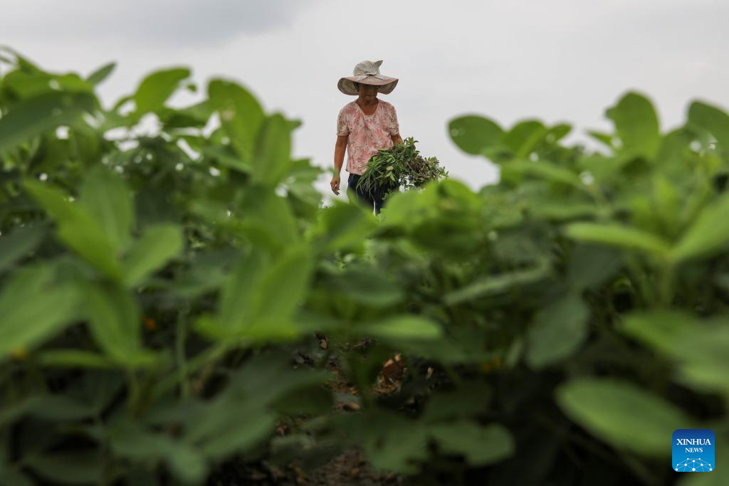 A farmer weeds a peanut field in Zhangbaqiao Township of Baofeng County, central China's Henan Province, Aug. 7, 2023. Tuesday marks "Liqiu", or the beginning of autumn, the first day of autumn on the Chinese lunar calendar. Farmers in different areas of the country are busy with harvesting. (Photo by He Wuchang/Xinhua)
