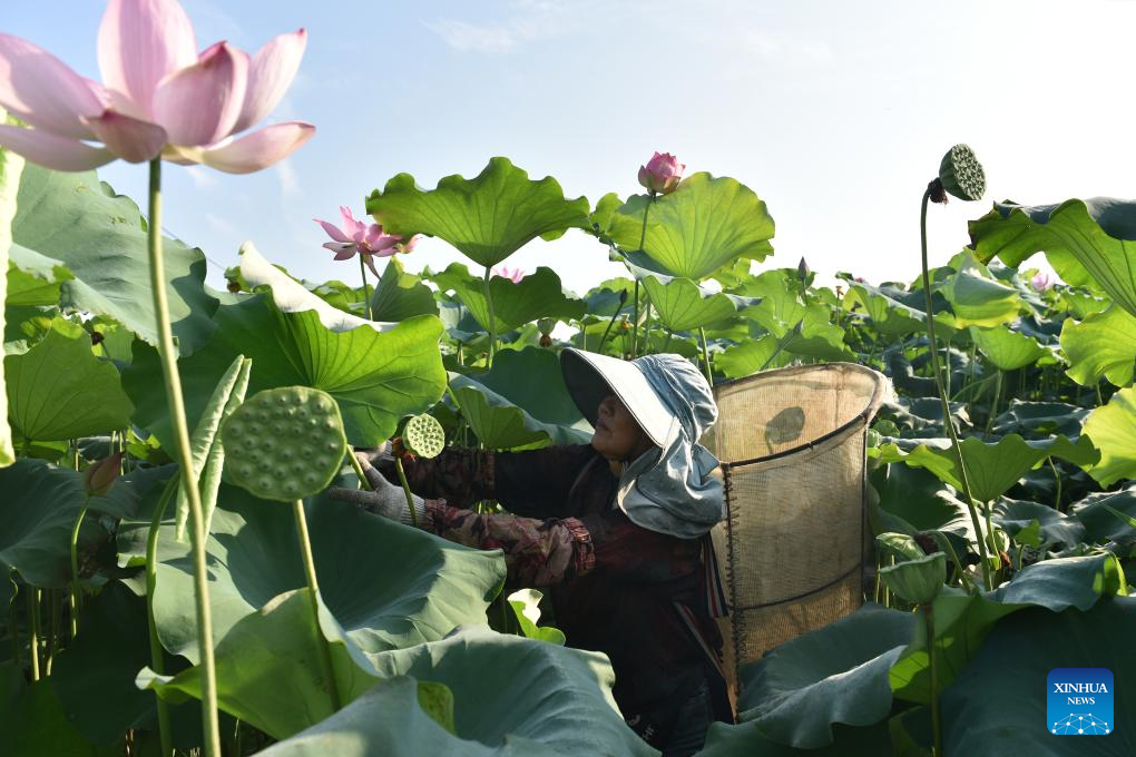 A farmer collects lotus seedpods in Hengdong County of Hengyang City, central China's Hunan Province, Aug. 7, 2023. Tuesday marks "Liqiu", or the beginning of autumn, the first day of autumn on the Chinese lunar calendar. Farmers in different areas of the country are busy with harvesting. (Photo by Xiao Yahui/Xinhua)