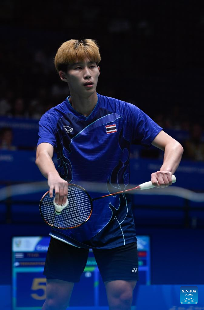 Panitchaphon Teeraratsakul of Thailand competes during the men's Singles Final match of badminton against Wang Zhengxing of China at the 31st FISU Summer World University Games in Chengdu, southwest China's Sichuan Province, Aug. 7, 2023. (Xinhua/Jigme Dorje)