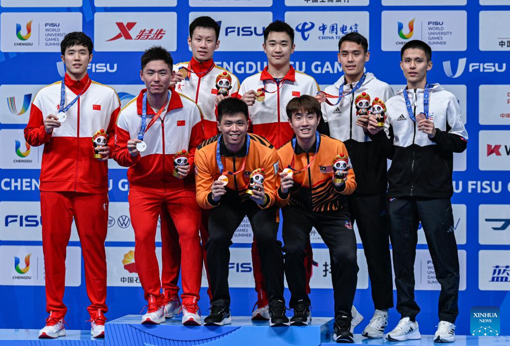 Gold medalists Ren Xiangyu (3rd L)/Tan Qiang (4th R) of China, silver medalists Zhou Haodong (2rd L)/He Jiting (1st L) of China, bronze medalists Po Li-Wei (2rd R)/Lee Fang-Chih (1st R) of Chinese Taipei and Wong Tien Ci (4th L)/Liew Xun of Malaysia attend the awarding ceremony for badminton men's doubles at the 31st FISU Summer World University Games in Chengdu, southwest China's Sichuan Province, Aug. 7, 2023. (Xinhua/Jigme Dorje)