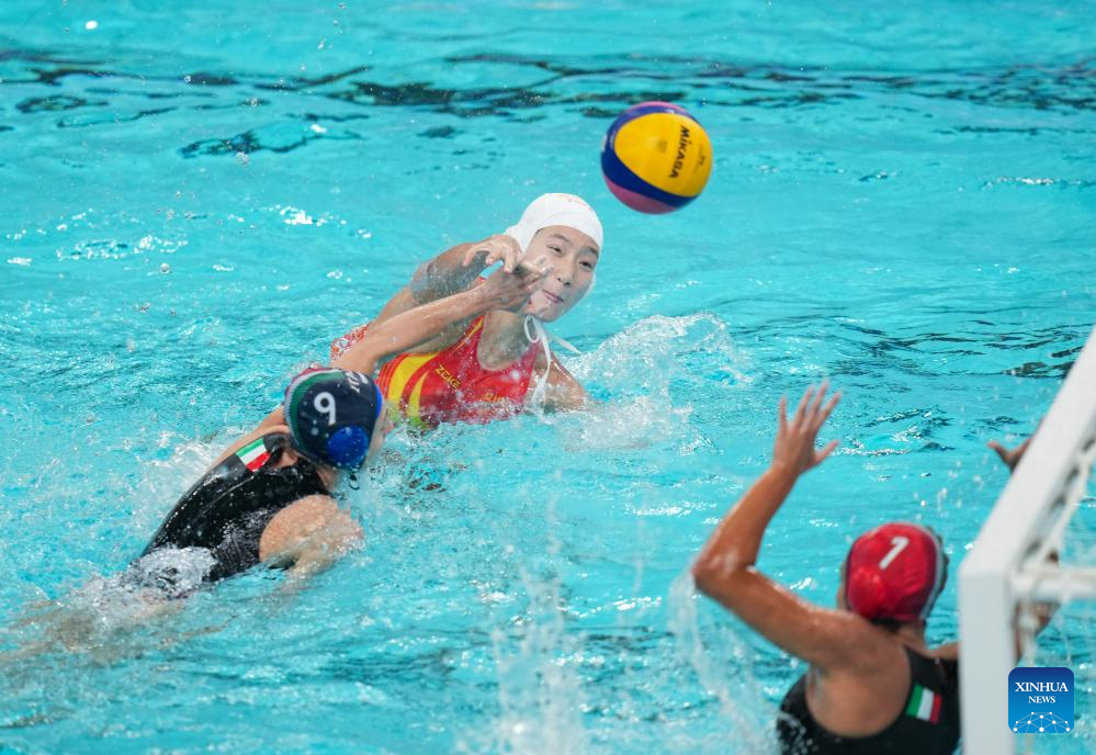 Wang Shiyun (C) of China vies with Cecilia Nardini (L) of Italy during the water polo women's gold medal match between China and Italy at the 31st FISU Summer World University Games in Chengdu, southwest China's Sichuan Province, Aug. 7, 2023. (Xinhua/Jiang Hongjing)