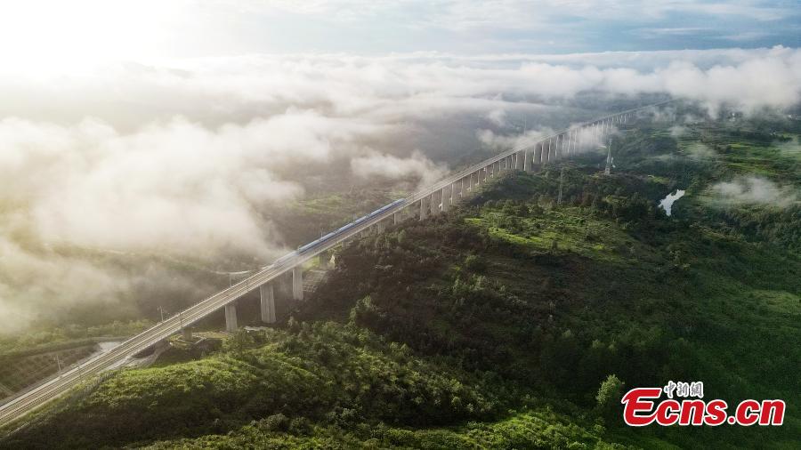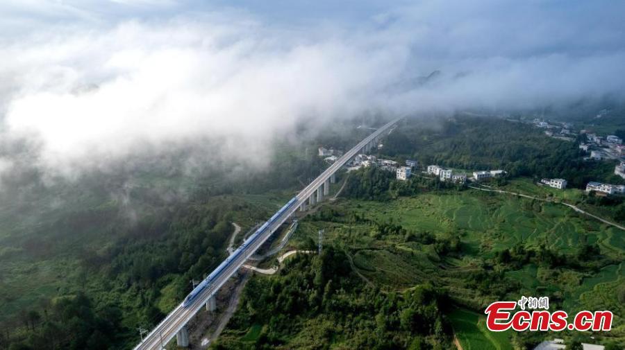 The first high-speed train D6171 runs on Gengzhuang Grand Bridge in southwest China's Guizhou Province, Aug. 8, 2023. (Photo: China News Service/Cai Chaoyang)