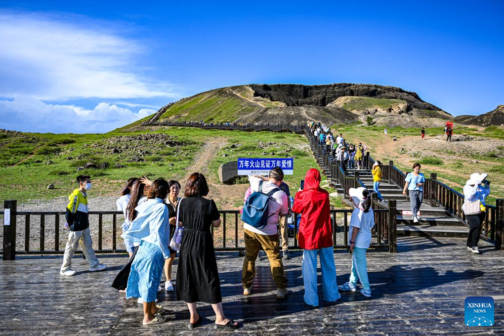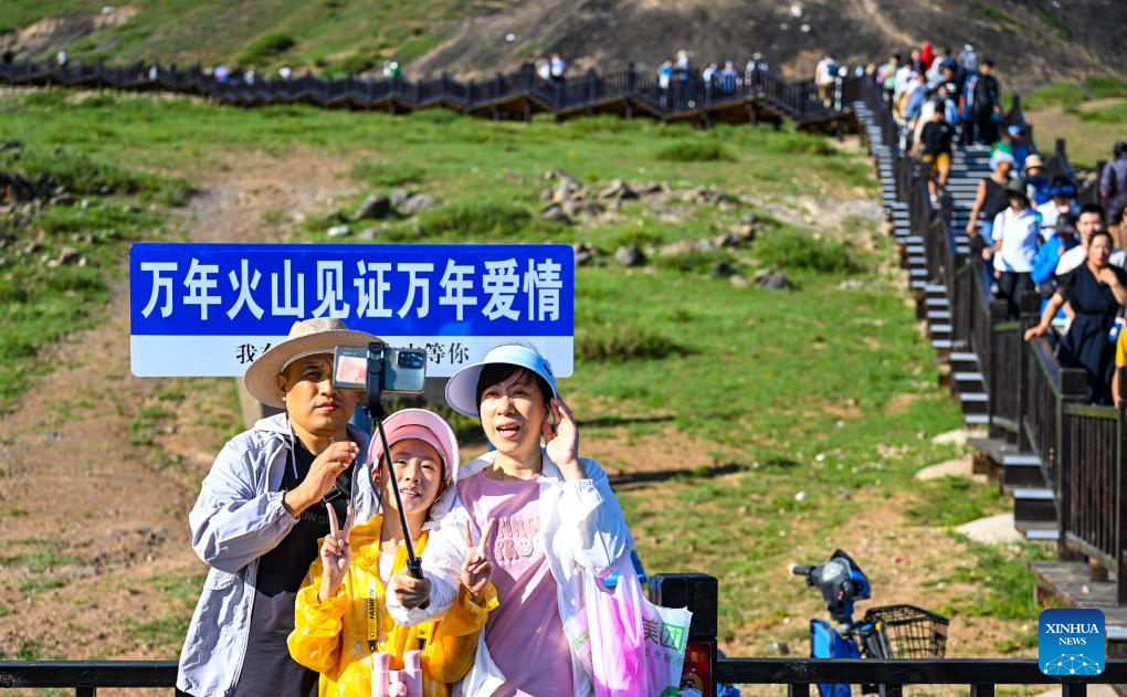 Tourists take photos in front of a volcano of the Ulanhada volcano cluster in Qahar Right Wing Rear Banner of Ulanqab, north China's Inner Mongolia Autonomous Region, Aug. 6, 2023. The Ulanhada volcano cluster has special geological landscapes such as volcanoes and lava landform. (Xinhua/Peng Yuan)