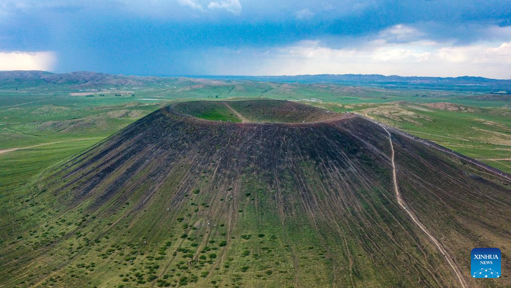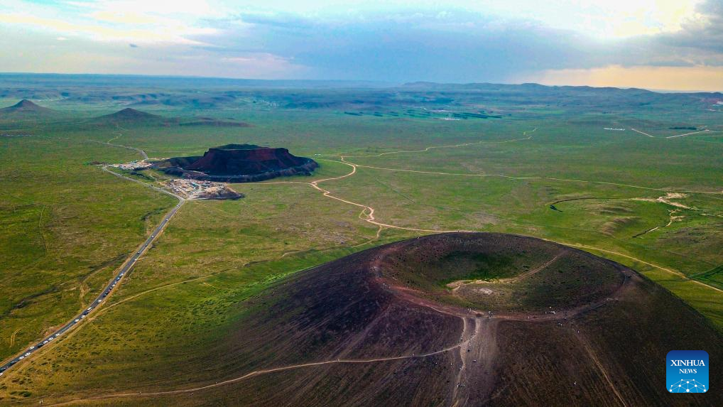 This aerial photo taken on Aug. 6, 2023 shows a volcano of the Ulanhada volcano cluster in Qahar Right Wing Rear Banner of Ulanqab, north China's Inner Mongolia Autonomous Region. The Ulanhada volcano cluster has special geological landscapes such as volcanoes and lava landform. (Xinhua/Peng Yuan)
