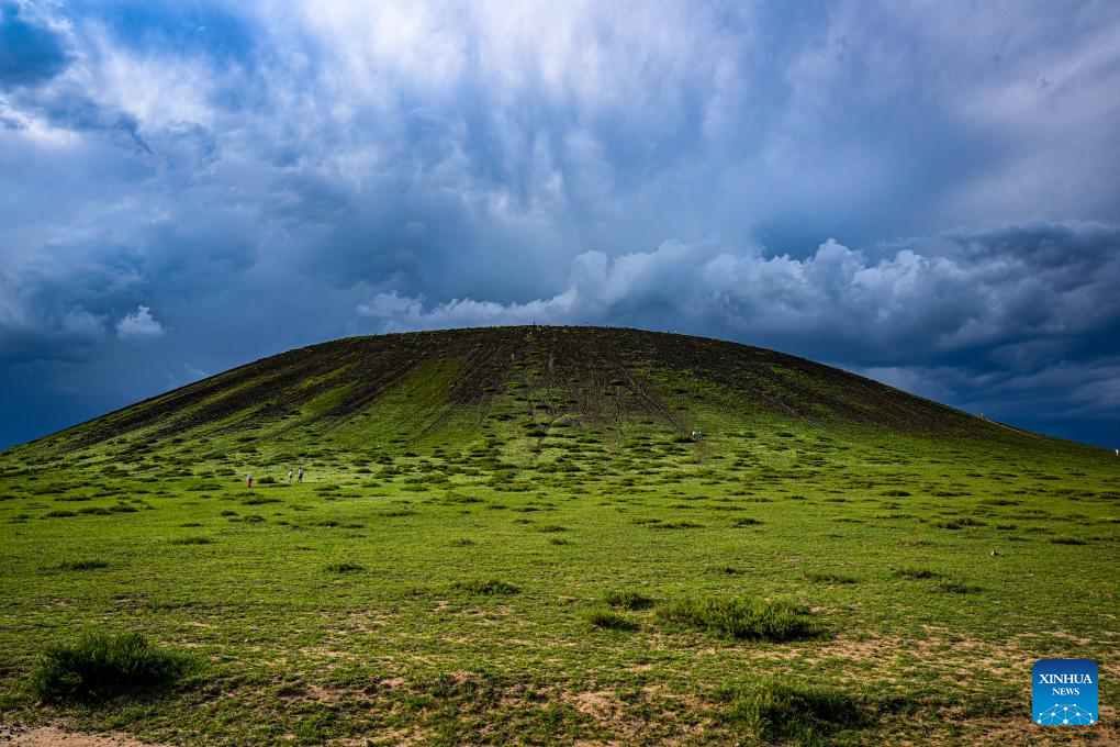 This photo taken on Aug. 6, 2023 shows a volcano of the Ulanhada volcano cluster after rainfalls in Qahar Right Wing Rear Banner of Ulanqab, north China's Inner Mongolia Autonomous Region. The Ulanhada volcano cluster has special geological landscapes such as volcanoes and lava landform. (Xinhua/Peng Yuan)