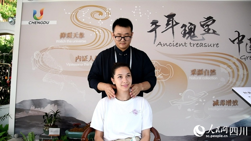 A visitor experiences a Chinese therapeutic massage at the traditional Chinese medicine culture area in the Main Media Center for the 31st FISU World University Games in Chengdu, capital of southwest China's Sichuan Province. (People's Daily Online/Wang Hongjiang)
