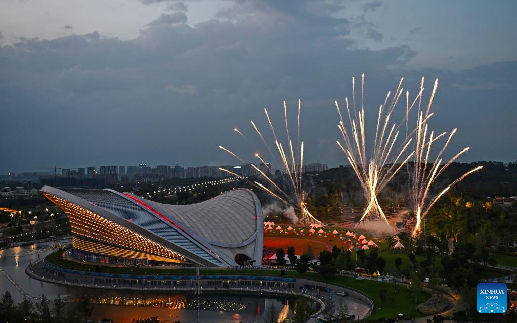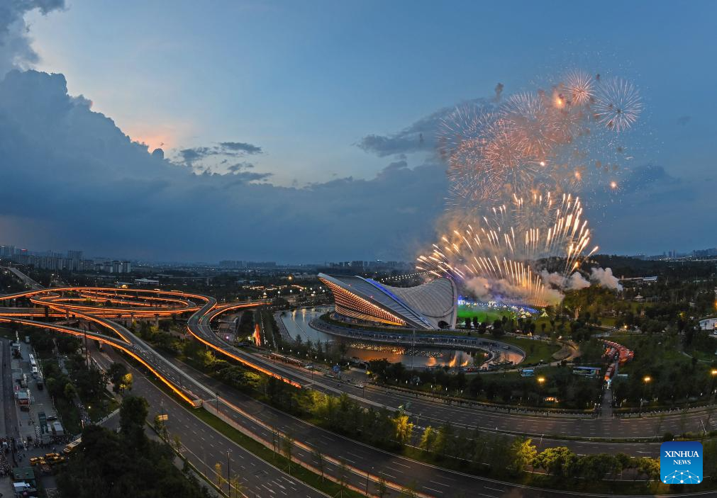 Fireworks are seen during the closing ceremony of the 31st FISU Summer World University Games in Chengdu, southwest China's Sichuan Province, Aug. 8, 2023. (Xinhua/Huang Wei)