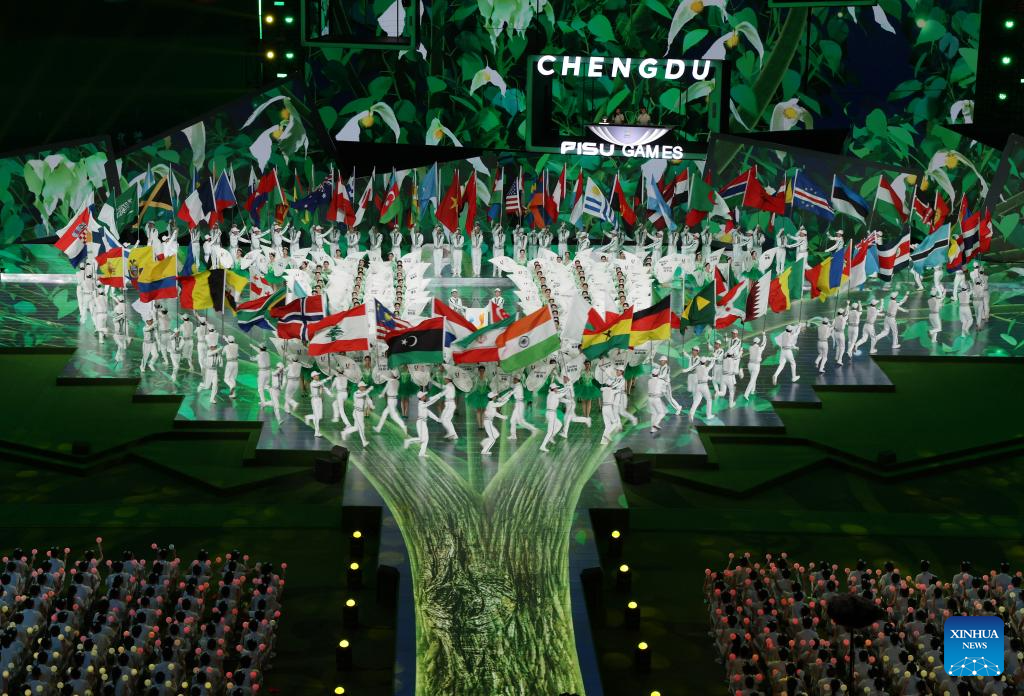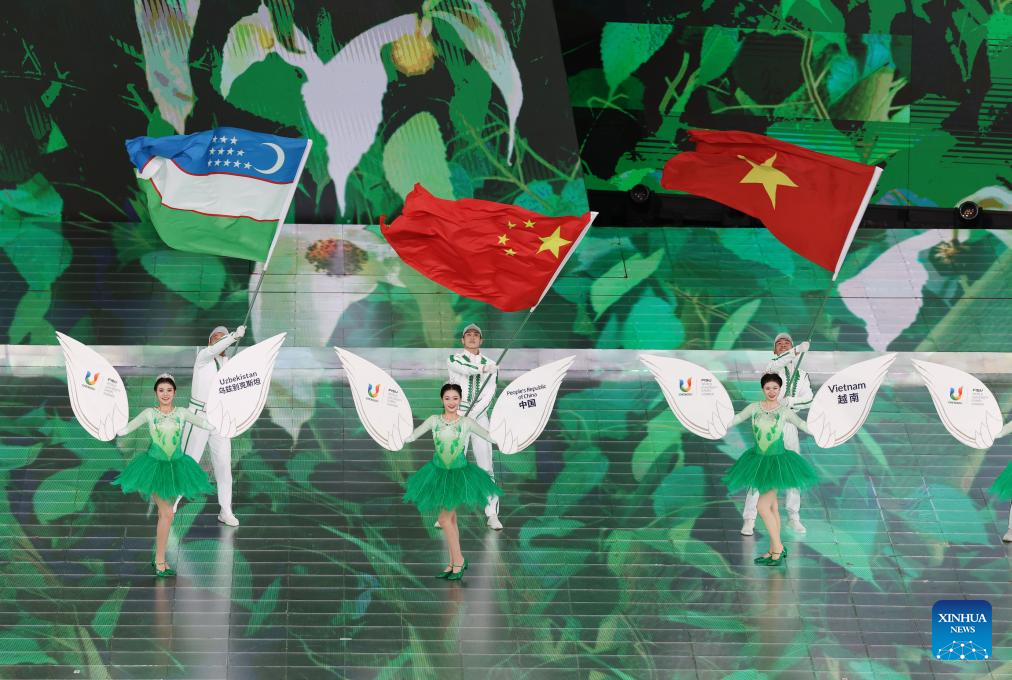 Flag and placard bearers parade during the closing ceremony of the 31st FISU Summer World University Games in Chengdu, southwest China's Sichuan Province, Aug. 8, 2023. (Xinhua/Wang Xi)