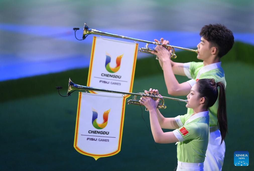 Musicians perform during the closing ceremony of the 31st FISU Summer World University Games in Chengdu, southwest China's Sichuan Province, Aug. 8, 2023. (Xinhua/Zhang Duan)