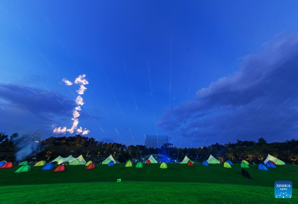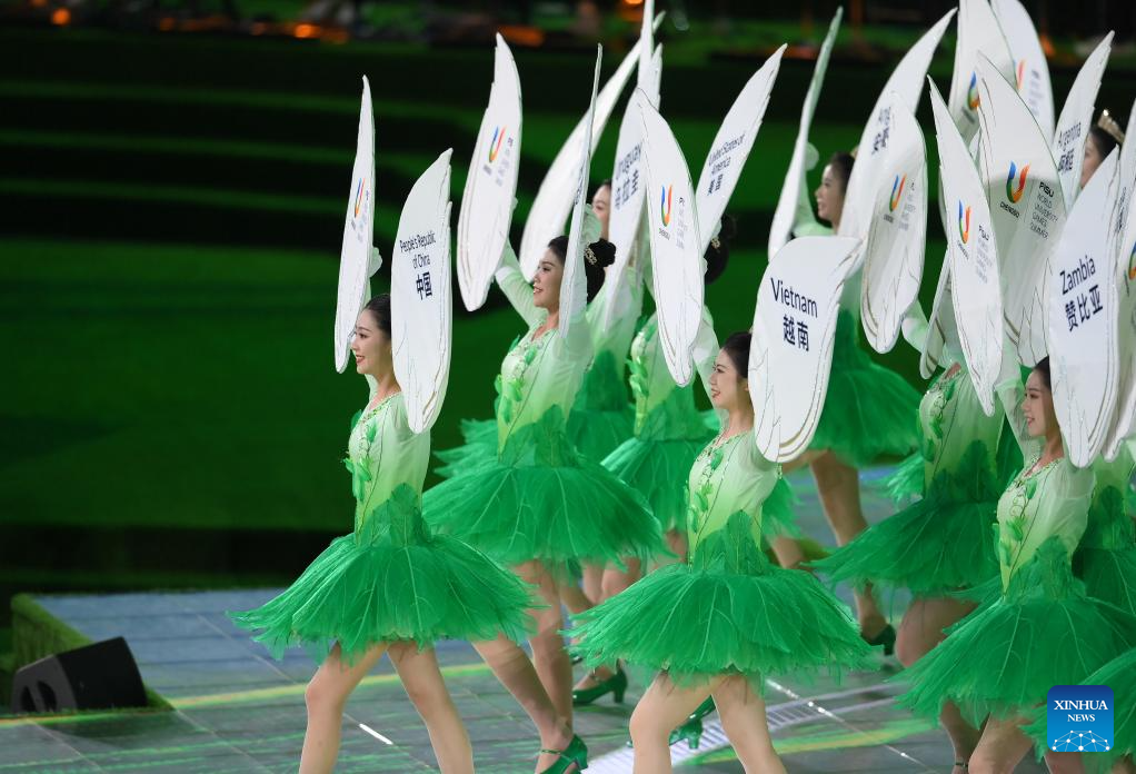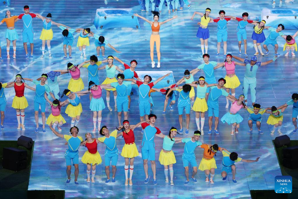 Artists are seen in a performance during the closing ceremony of the 31st FISU Summer World University Games in Chengdu, southwest China's Sichuan Province, Aug. 8, 2023. (Xinhua/Zhang Long)