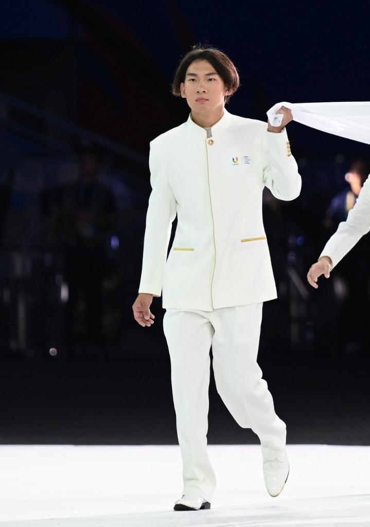 Su Yiming holds the FISU flag during the opening ceremony of the Chengdu Universiade, July 28, 2023. (Xinhua/Xu Bingjie)