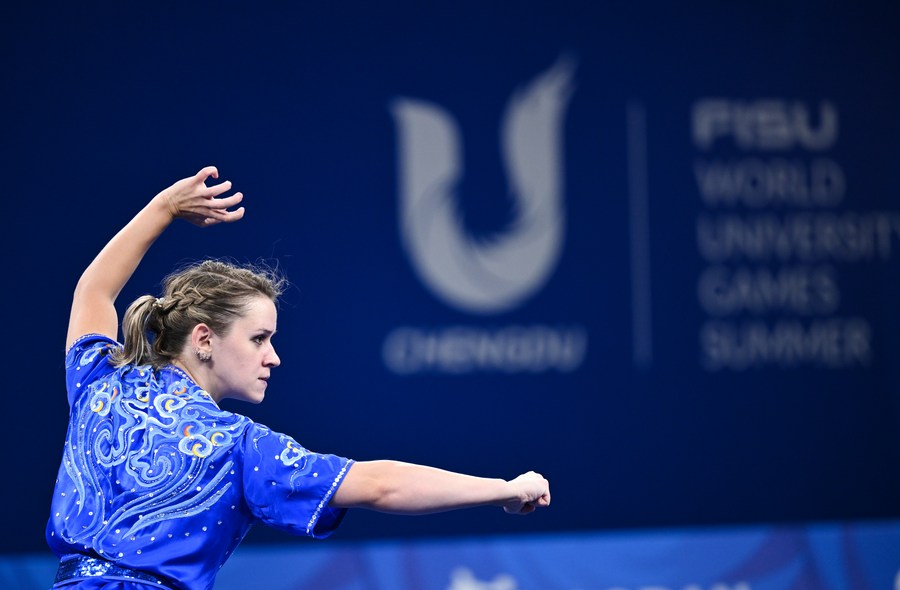 Darya Latisheva of Uzbekistan competes in the Wushu women's Nanquan at the Chengdu Universiade, July 30, 2023. (Xinhua/Wang Xi)