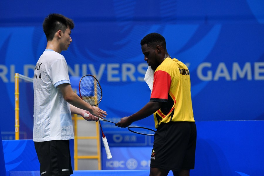 Wang Zhengxing (L) presents a racket to Amos Muyanja of Uganda during the badminton men's singles round of 64 match at the Chengdu Universiade, Aug. 4, 2023. (Xinhua/Zhang Duan)
