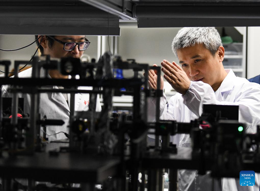 Peng Chengzhi talks with a student at a laboratory in the University of Science and Technology of China in Hefei, east China's Anhui Province, July 21, 2023. (Xinhua/Zhang Duan)