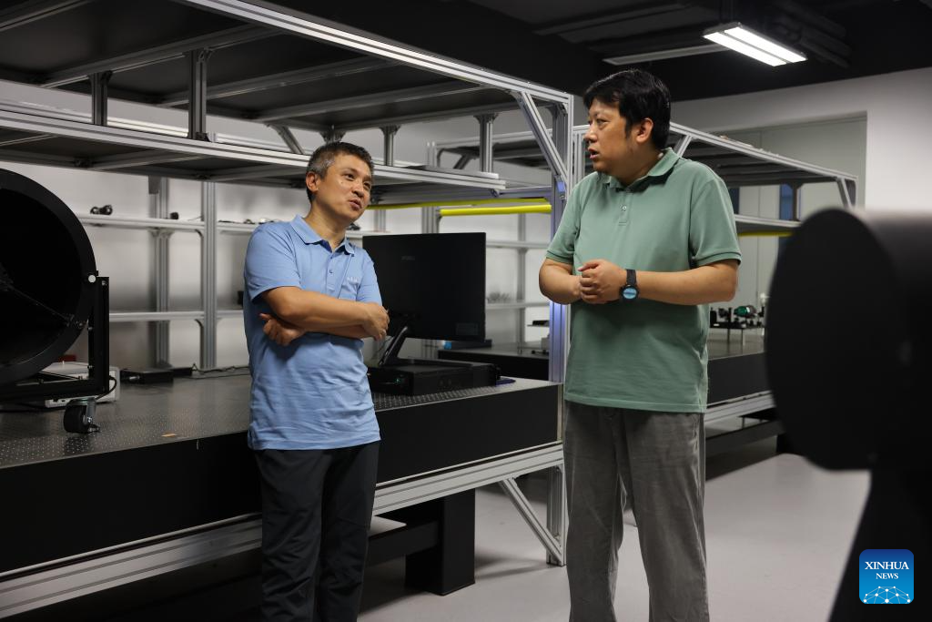 Peng Chengzhi (L) talks with Professor Ren Jigang at the Institute of Advance Technology of the University of Science and Technology of China in Hefei, east China's Anhui Province, July 21, 2023. (Xinhua/Jin Liwang)