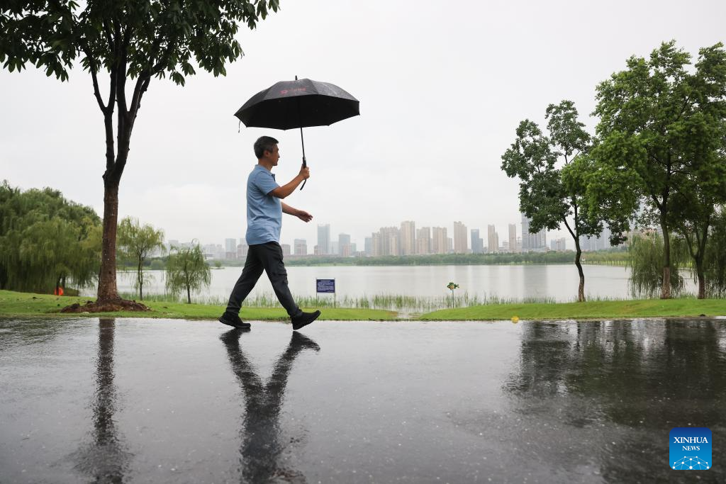 Peng Chengzhi walks alongside a lake in Hefei, east China's Anhui Province, July 21, 2023. (Xinhua/Jin Liwang)