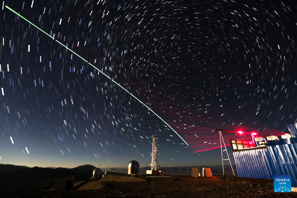This composite photo taken on Dec. 9, 2016 shows a satellite-to-earth link established between quantum satellite "Micius" and the quantum teleportation experiment platform in Ali, southwest China's Tibet Autonomous Region. (Xinhua/Jin Liwang)