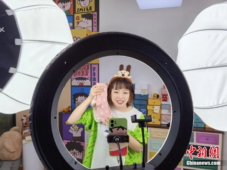 A livestream host promotes socks produced in Datang subdistrict of Zhuji city, east China's Zhejiang Province. Datang subdistrict is the largest hosiery production base in the world. (Photo/Datang subdistrict)