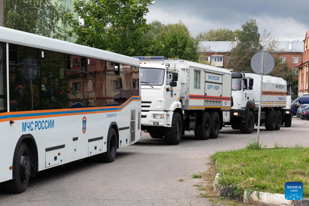 Rescuers arrive at the blast site of a plant in Moscow region, Russia, Aug. 9, 2023. Forty-three people have been injured so far in a blast at an optical-mechanical plant in the city of Sergiev Posad in the Moscow region on Wednesday, local authorities said. The explosion happened on Wednesday morning at around 10:40 a.m. local time (0740 GMT) at a pyrotechnics warehouse, which was being rented out on the optical-mechanical plant's territory by a private company, said Governor of the Moscow Region Andrei Vorobiev in a Telegram post. (Xinhua/Bai Xueqi)