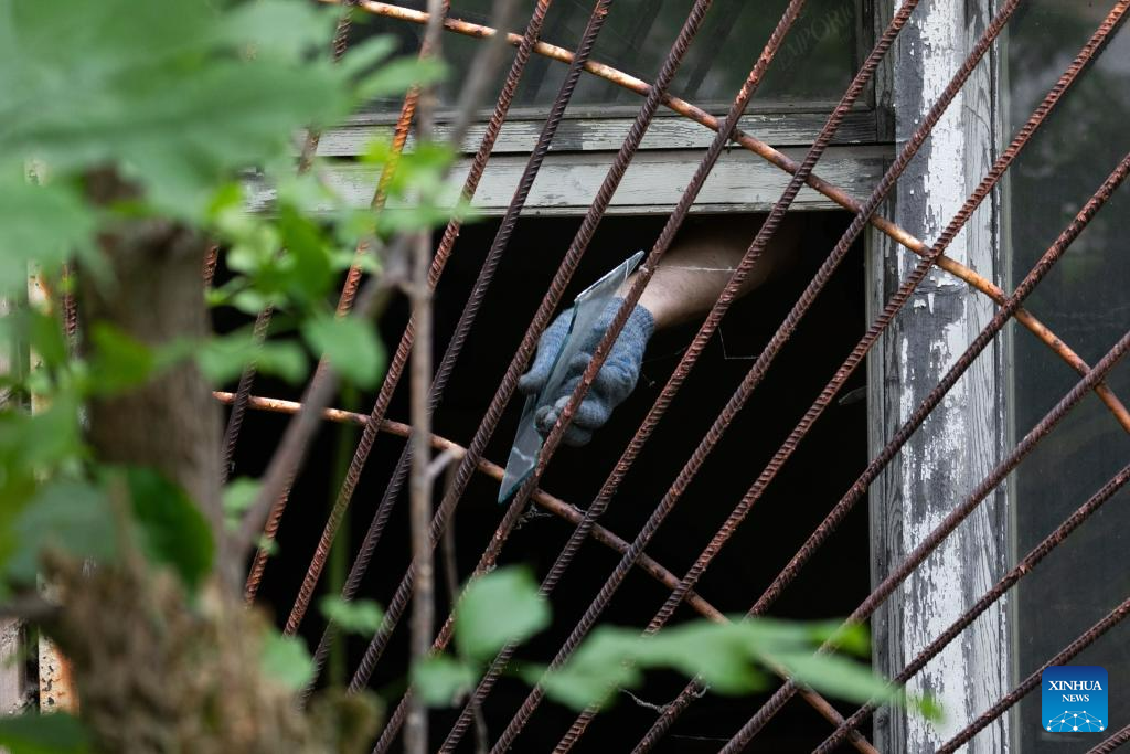 A staff worker clears broken glass at the blast site of a plant in Moscow region, Russia, Aug. 9, 2023. Forty-three people have been injured so far in a blast at an optical-mechanical plant in the city of Sergiev Posad in the Moscow region on Wednesday, local authorities said. (Xinhua/Bai Xueqi)