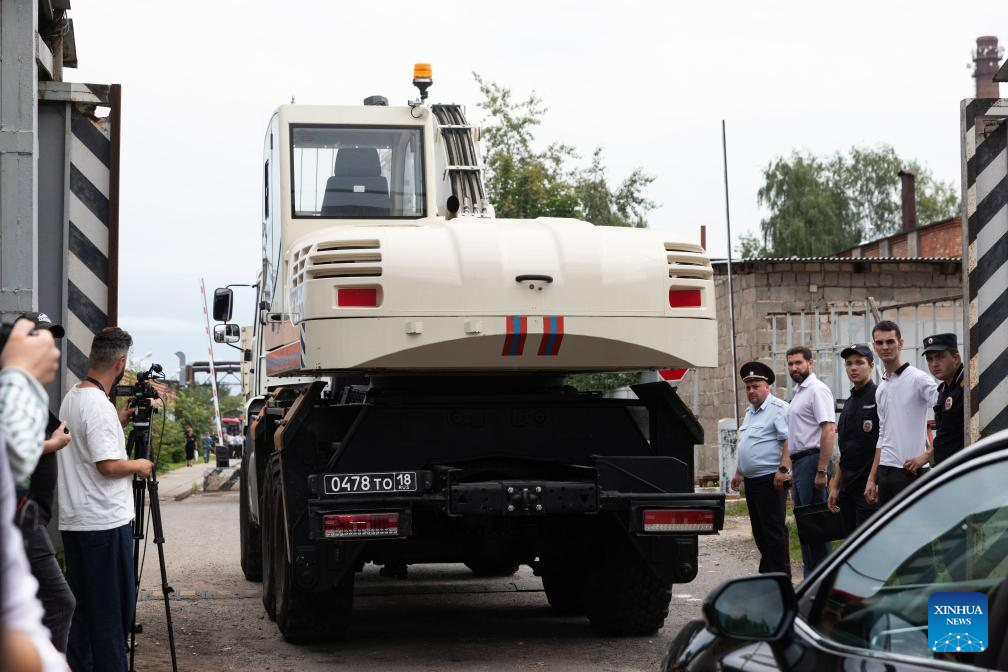 A rescue vehicle arrives at the blast site of a plant in Moscow region, Russia, Aug. 9, 2023. Forty-three people have been injured so far in a blast at an optical-mechanical plant in the city of Sergiev Posad in the Moscow region on Wednesday, local authorities said. (Xinhua/Bai Xueqi)