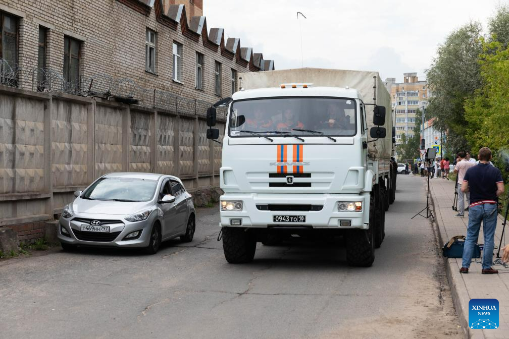 An ambulance leaves the blast site of a plant in Moscow region, Russia, Aug. 9, 2023. Forty-three people have been injured so far in a blast at an optical-mechanical plant in the city of Sergiev Posad in the Moscow region on Wednesday, local authorities said. The explosion happened on Wednesday morning at around 10:40 a.m. local time (0740 GMT) at a pyrotechnics warehouse, which was being rented out on the optical-mechanical plant's territory by a private company, said Governor of the Moscow Region Andrei Vorobiev in a Telegram post. (Xinhua/Bai Xueqi)