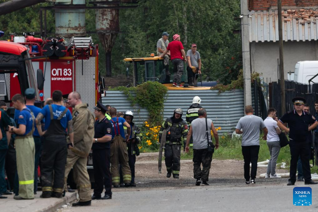 Rescuers are seen at the blast site of a plant in Moscow region, Russia, Aug. 9, 2023. Forty-three people have been injured so far in a blast at an optical-mechanical plant in the city of Sergiev Posad in the Moscow region on Wednesday, local authorities said. (Xinhua/Bai Xueqi)