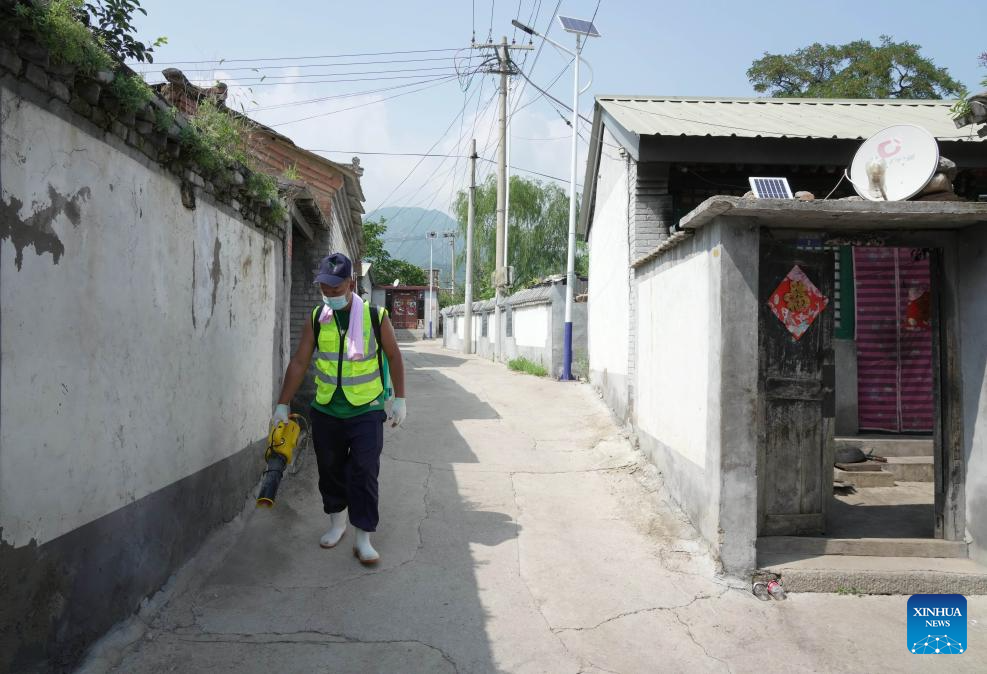 A staff worker conducts disinfection in Nanzhuang Village of Jiulong Town, Laishui County, north China's Hebei Province, Aug. 9, 2023. Some villages in Laishui County encountered traffic and communication disruptions caused by the recent heavy rainfall brought by Typhoon Doksuri. At present, the local authorities is conducting environmental disinfection to prevent epidemics after the floods. (Xinhua/Yang Shiyao)